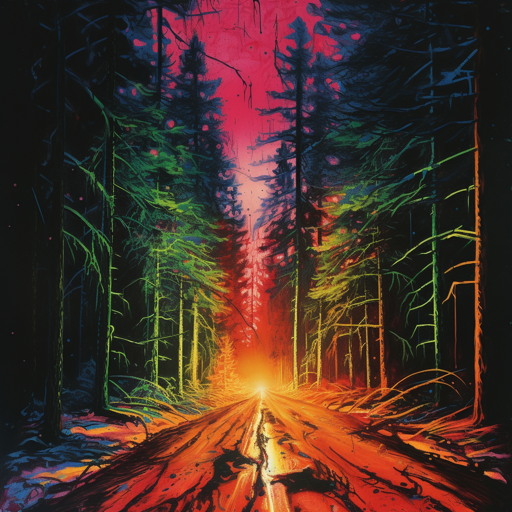 Every tree in the woods had skeletal branches. At the bottom of a dip in the path was a ring of trees. Unlike the others, their leaves still thrived. On several of the thicker stems sat a line of green and red lumps. The glow was dim, but enough to resemble a string of Christmas lights.